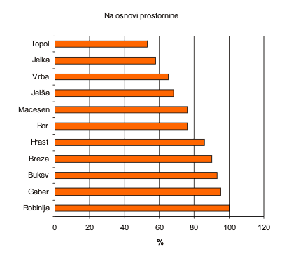 Primerjava energijskih vednosti drevesnih vrst na osnovi prostornine (osnova je energijska vrednost Robinije)